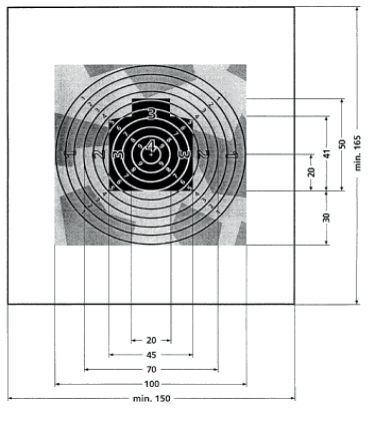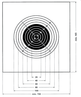 Die kombinierte Scheibe A hat einen weissen Grund von mindestens 150 cm Breite und 165 cm Höhe und einen schwarzen Kreis von 60 cm Durchmesser als Zentrum. Das Trefferfeld von 100 cm Durchmesser ist in 5 bzw. 10 gleichmässige Kreise eingeteilt.